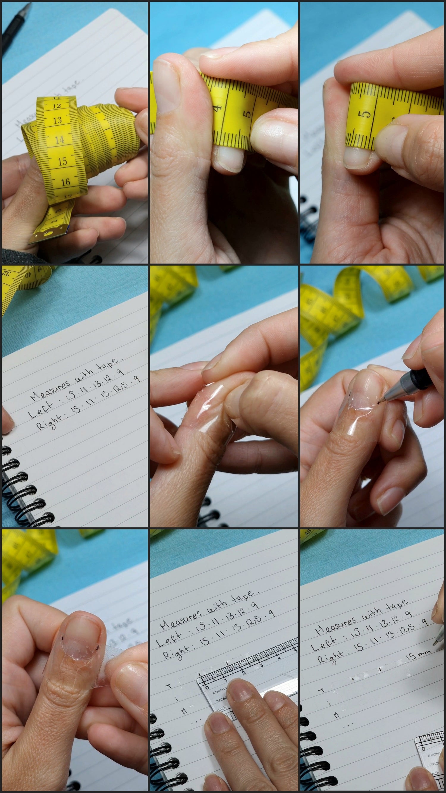 Make sure to measure on bare nails and both hands, as sizes can differ.