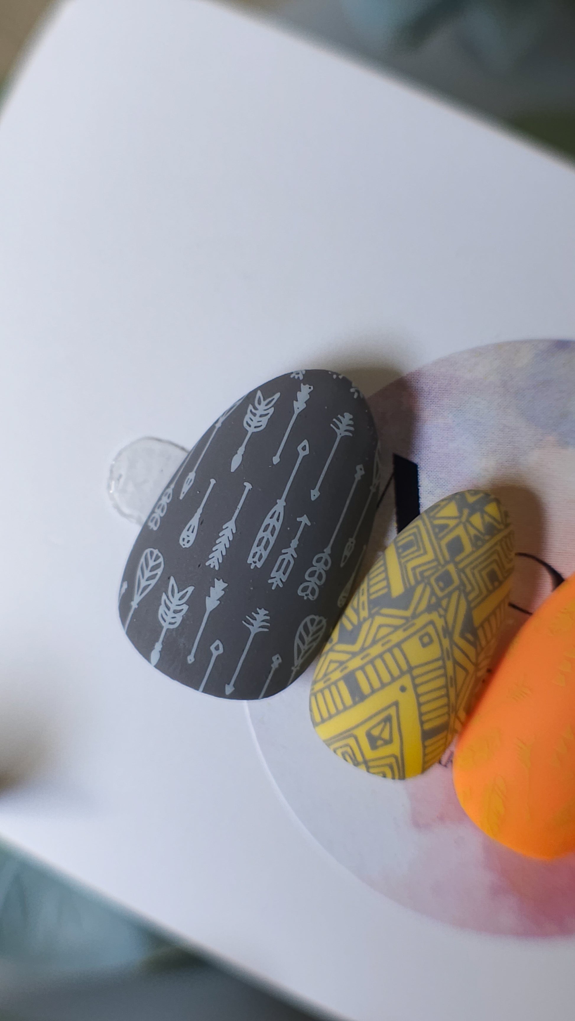 The Aboriginal Press on Nails set features a dark grey thumb adorned with light grey arrow patterns, a yellow and dark grey patterned index, and three additional nails showcasing orange and yellow feather designs. The matte finish offers a modern aesthetic, making these nails ideal for those seeking a unique, artistic look.