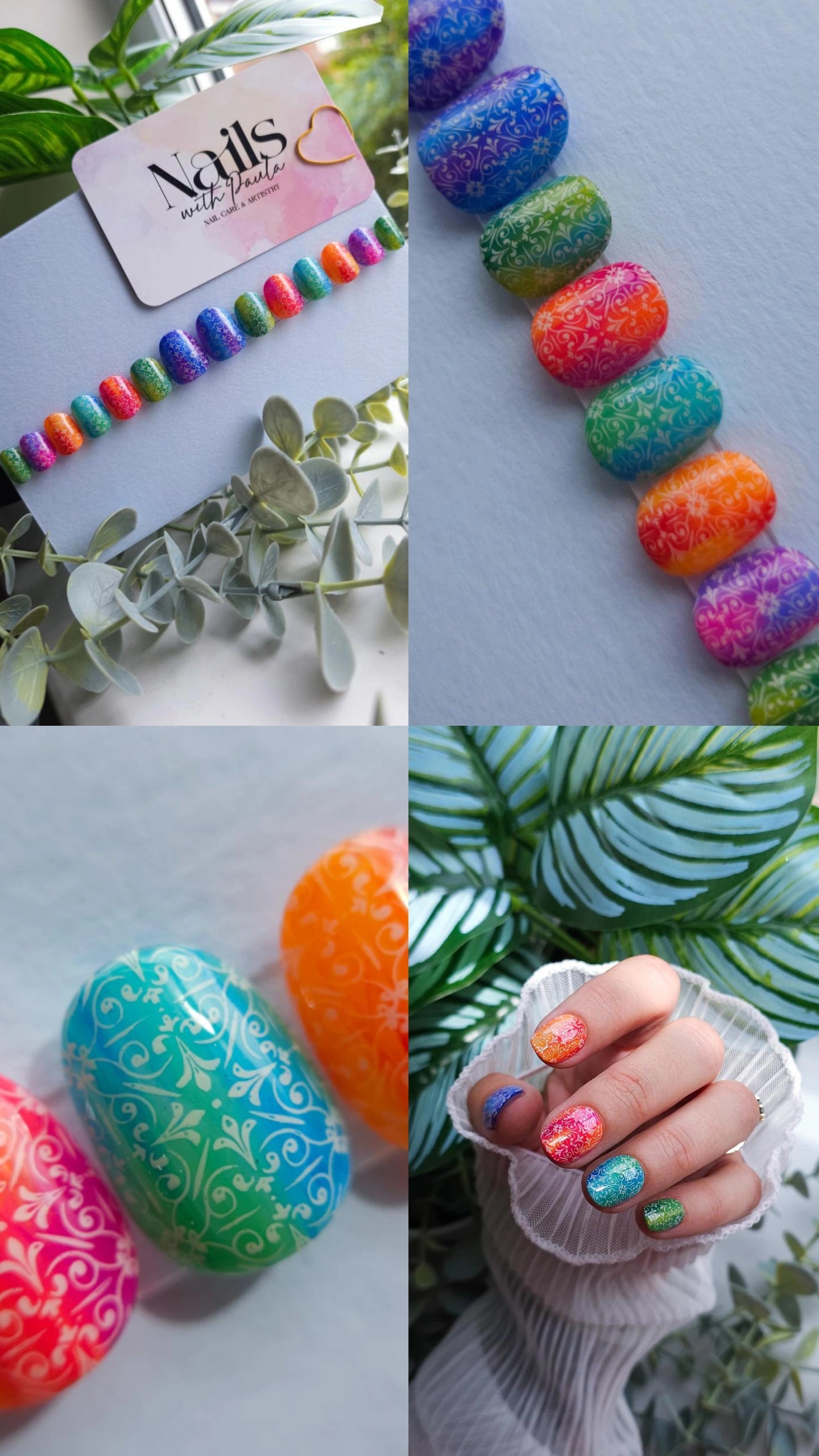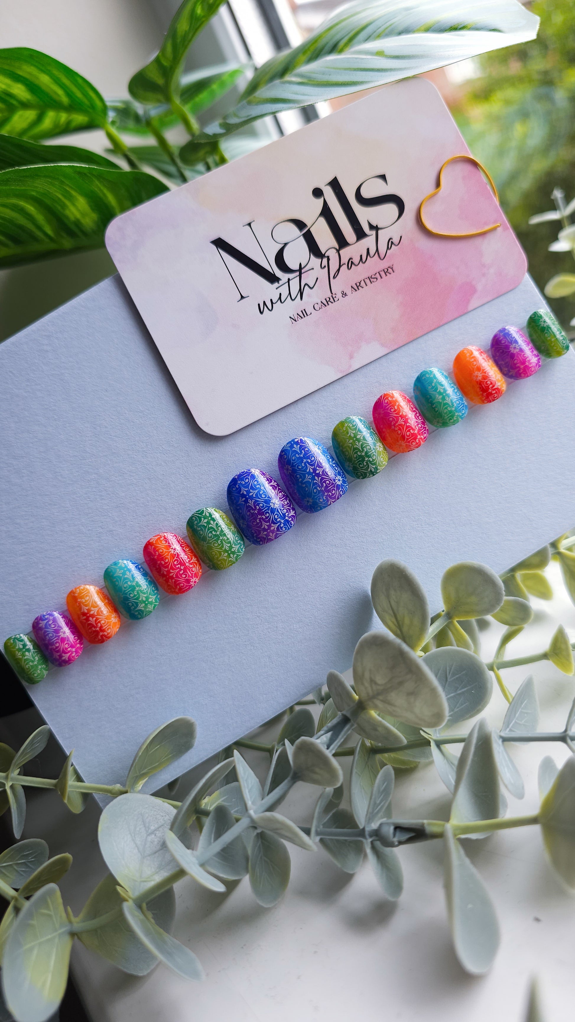 The Colourful Casablanca set of press-on nails brings together vibrant shades of purple, blue, pink, orange, red, yellow, and green. Each nail is accented with a cream-colored mosaic pattern, creating a distinctive and lively design that adds a bold and super original touch to your look.