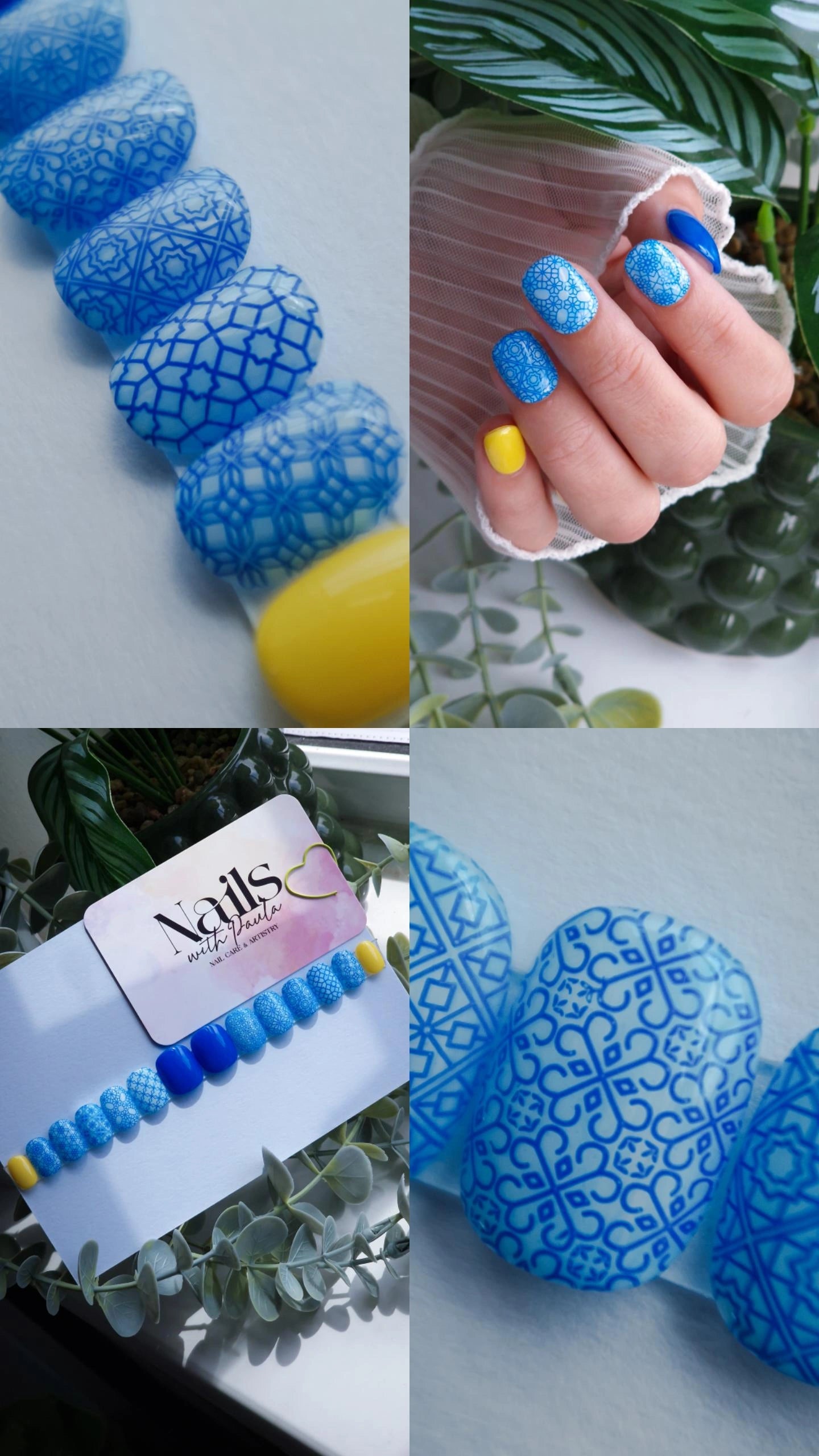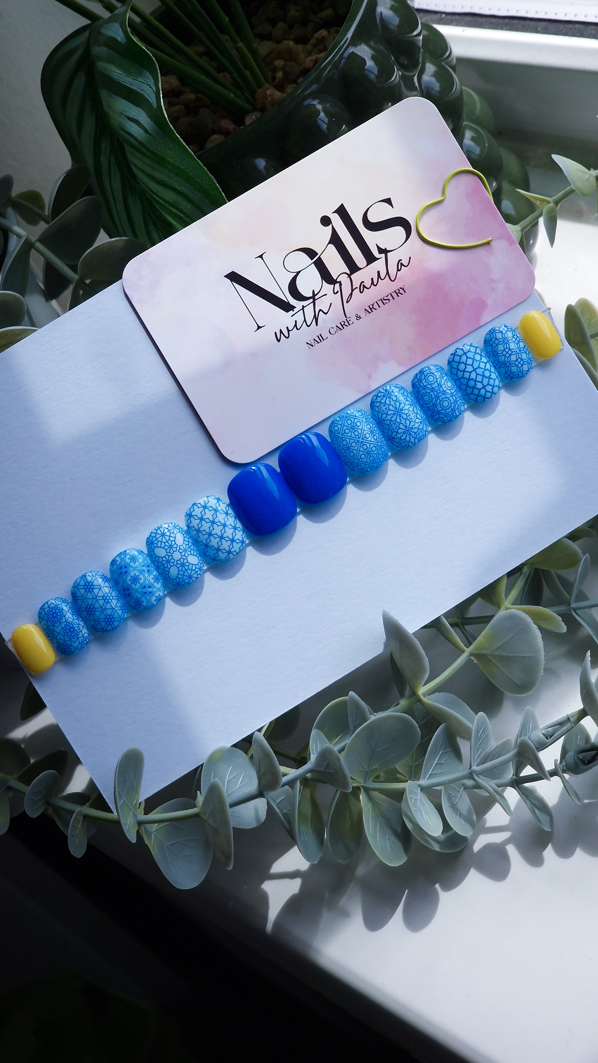 This set of press-on nails draws inspiration from eastern mystic mosaics, featuring a tile-like pattern in light and azure blue tones. A few nails stand out in solid yellow and solid blue, adding vibrant contrast to the design. This set brings an exciting and unique touch to your manicure.