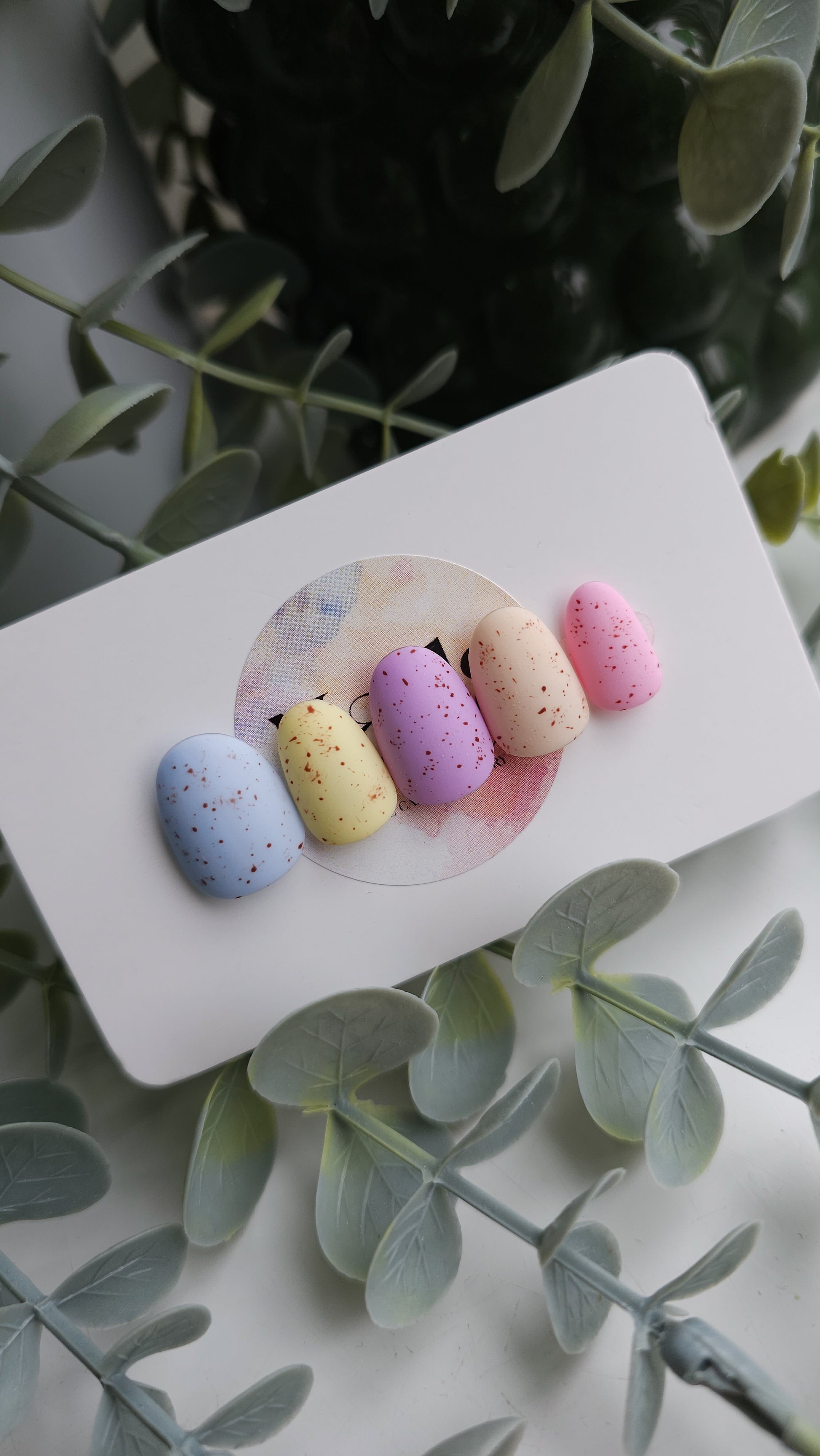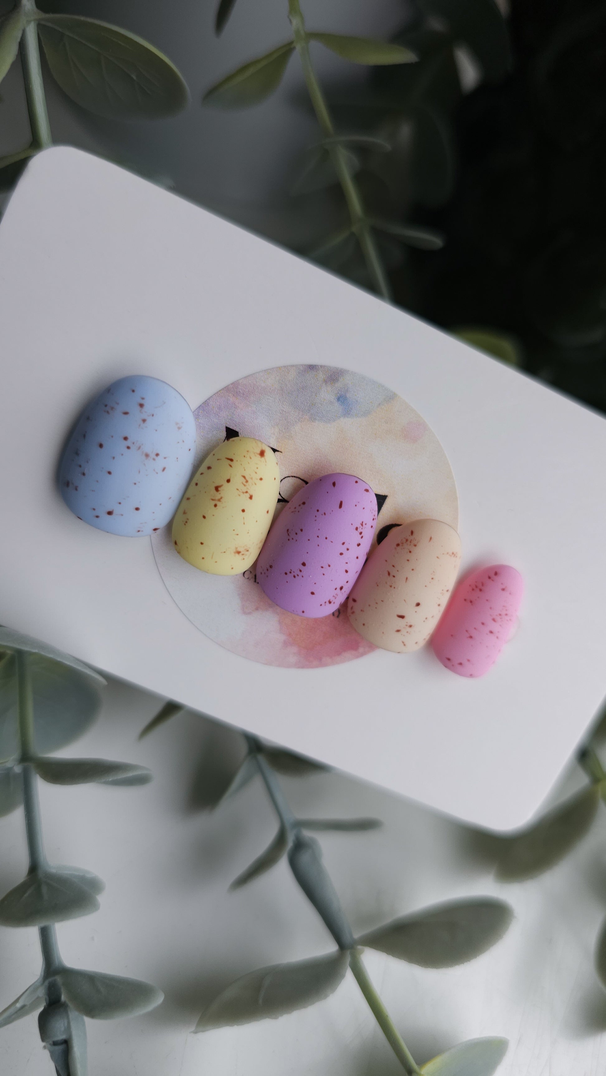 Introducing the Mini Eggs Easter Nails, a set of press-on nails inspired by festive mini chocolate eggs. This set features five pastel colours, pink, purple, yellow, blue and cream along with a speckled brown finish to mimic chocolate. The matte top coat enhances the authentic look, providing a unique seasonal accessory.