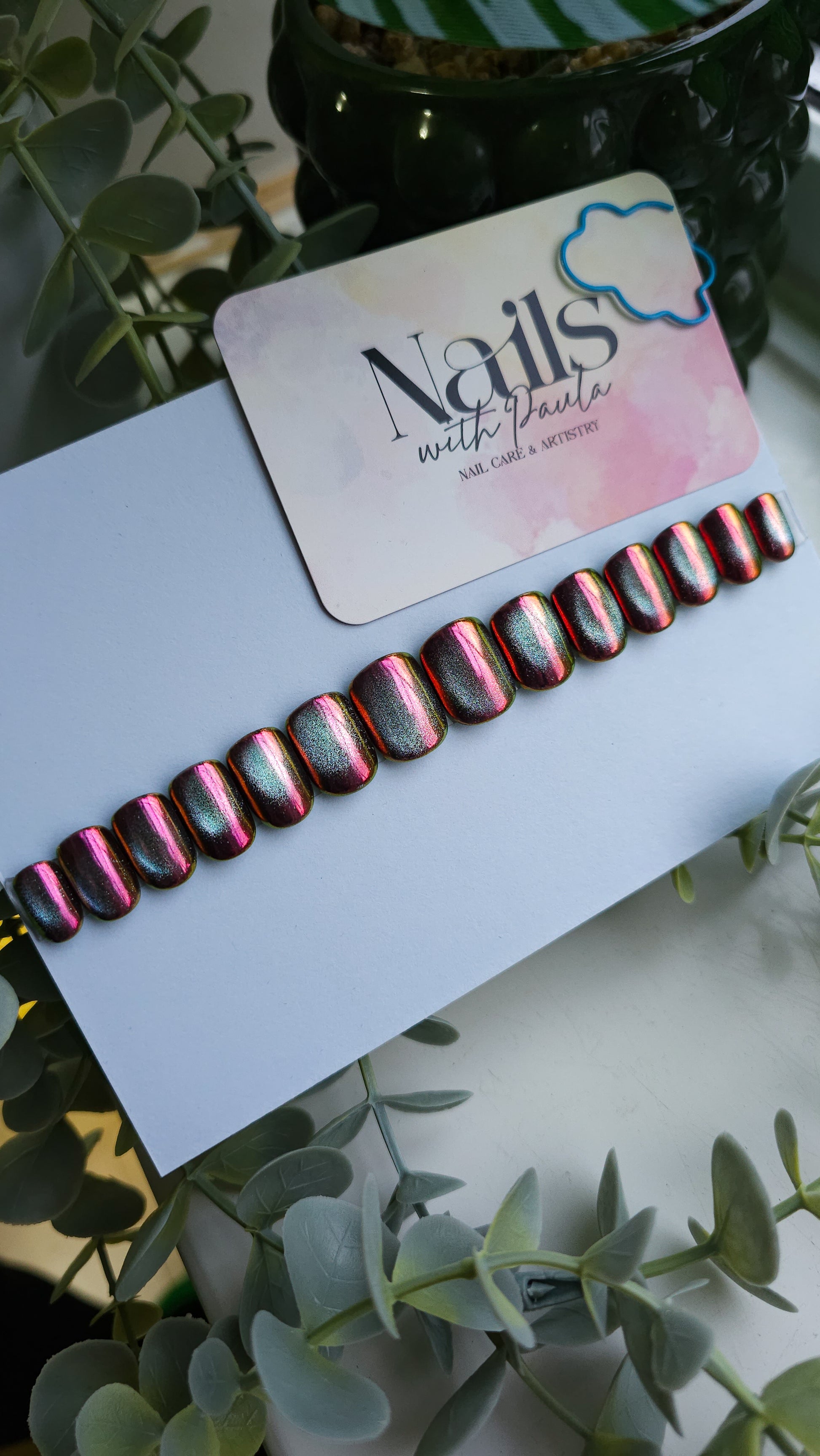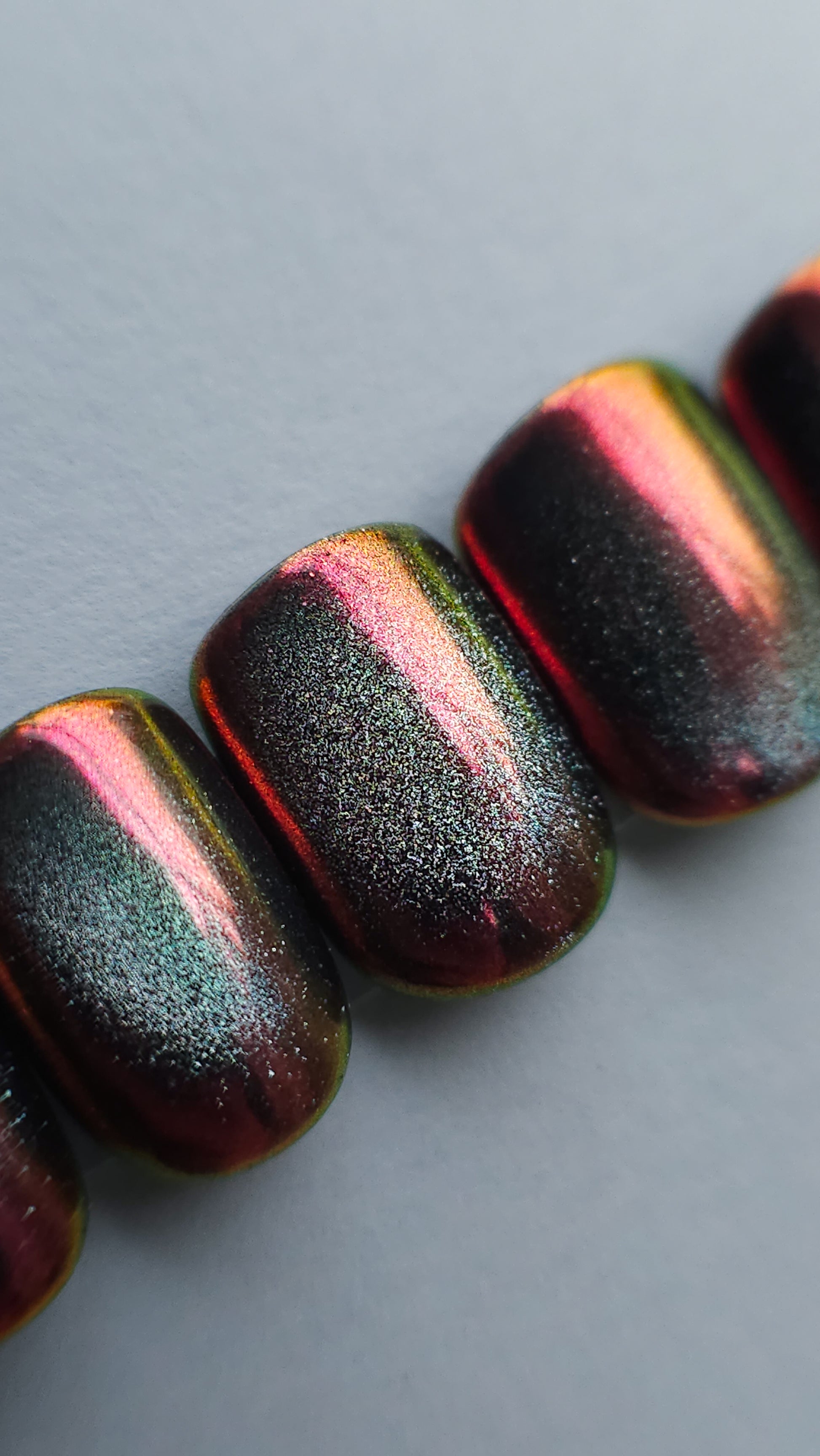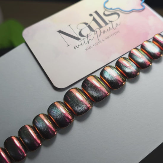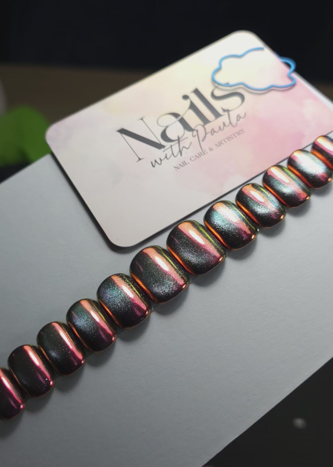 Set of press on nails with a chrome finish that transforms with the light. Layered with silver cat eye gel which has magnetic particles for a shimmering effect, then topped with multichromatic chrome powder. Watch the colour shift from pink, orange, and red through gold and green and even blue for the magnetic glitter at the centre. A dynamic, light-reactive design that catches attention from every angle like wearable galaxies.