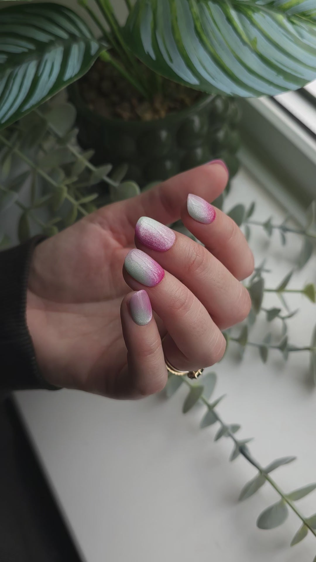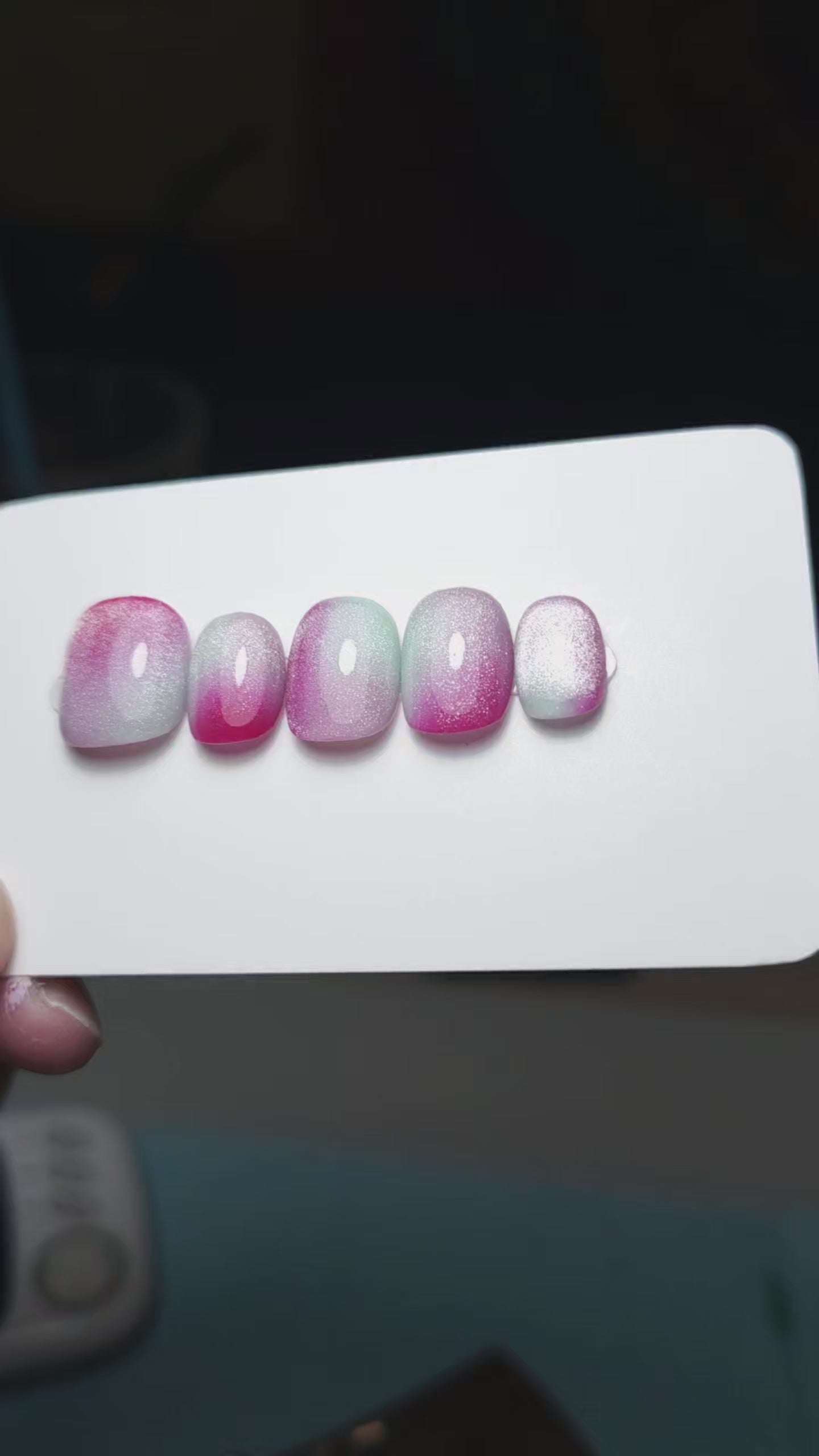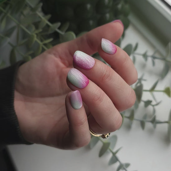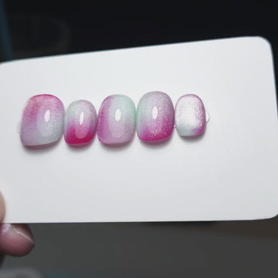 Press on nails set in a delicate trio mauve, lightest blue green, cherry red. Each nail offers a different positioning of the colours, they are all topped with soft prism cat eye, looking mesmerising.
