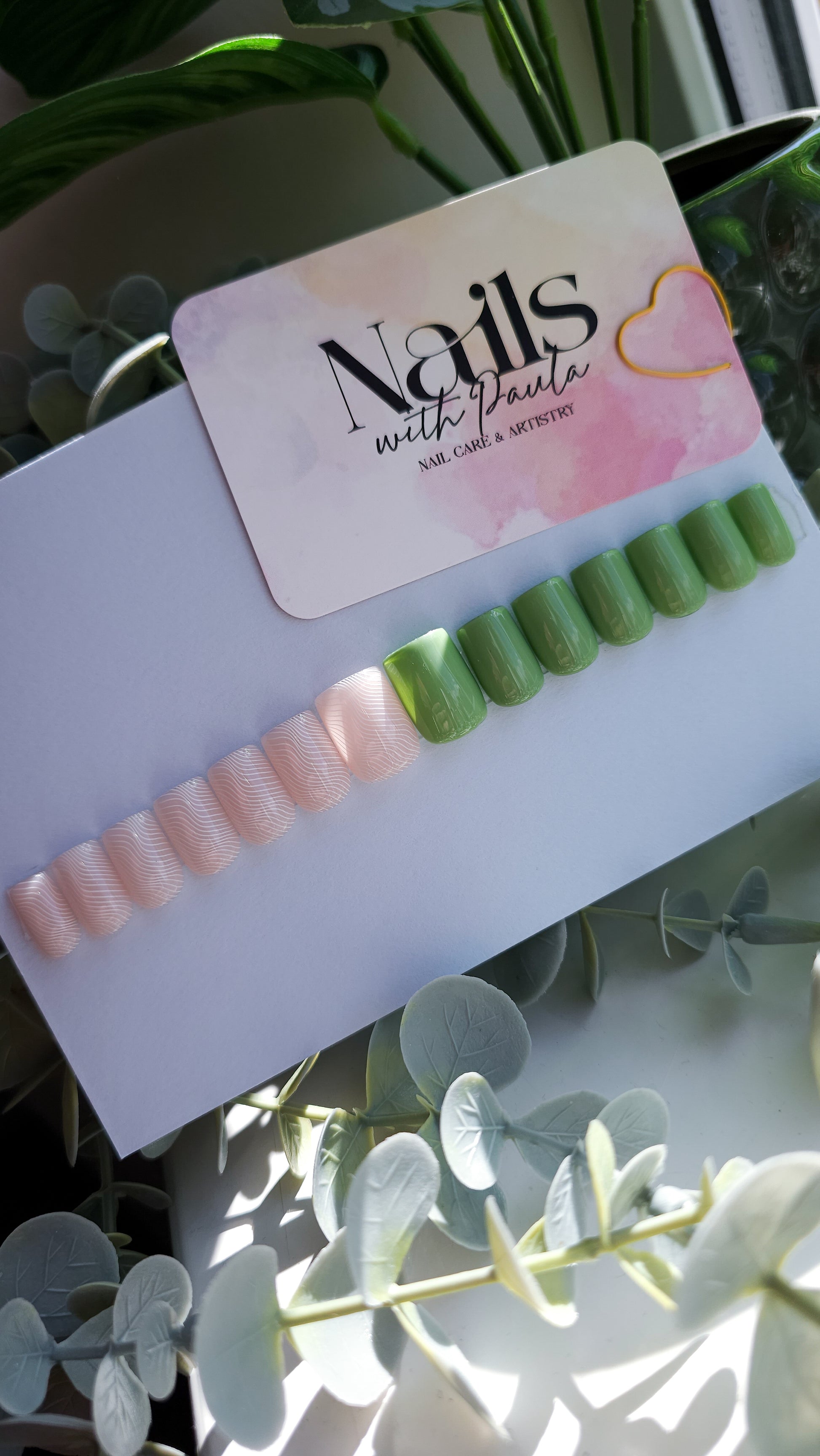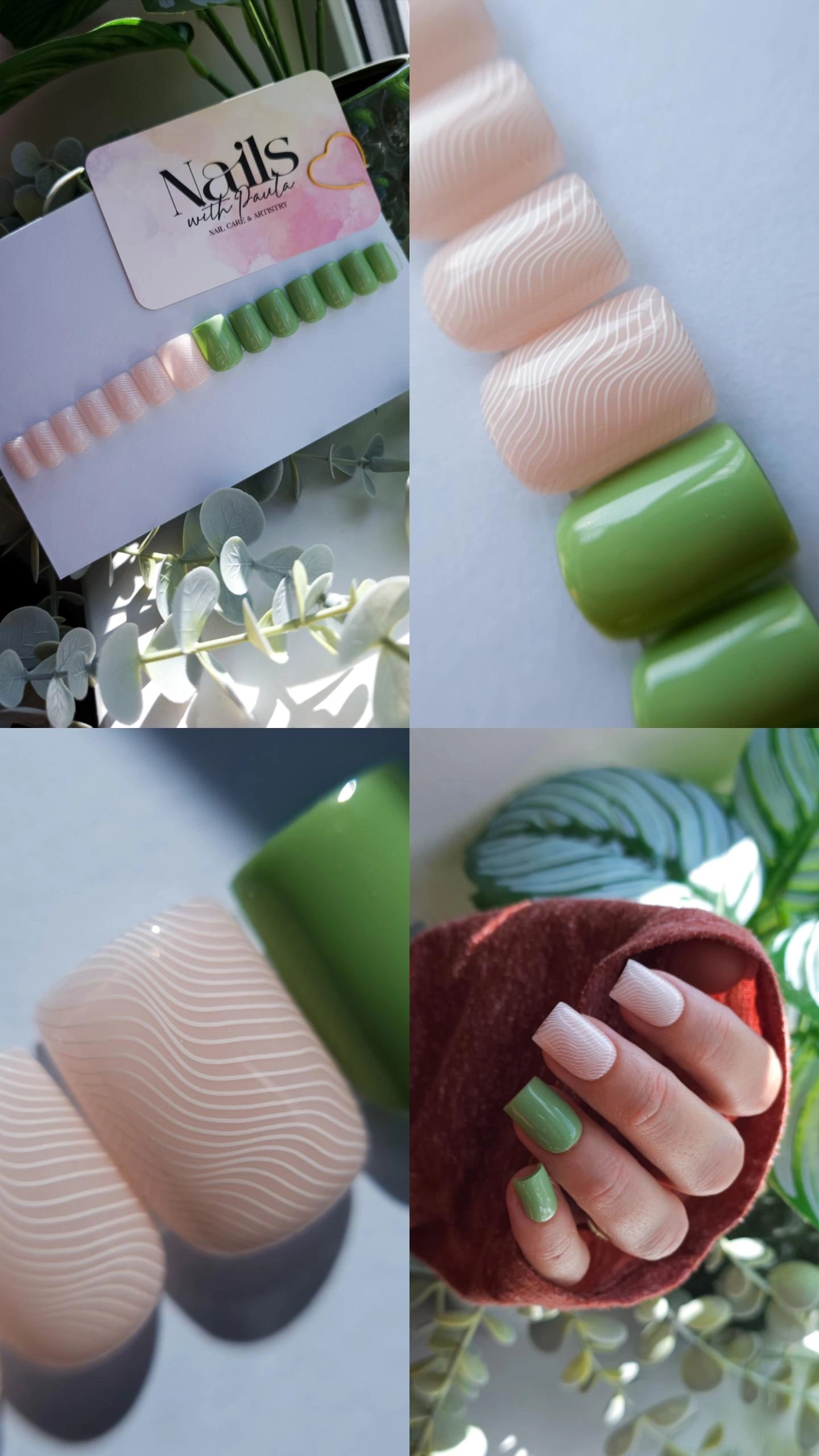 This set of press-on nails combines delicate abstract wavy white lines on a natural beige base for half the nails, with a soft light olive green solid color on the other half. The design offers a harmonious and fresh look, perfect for adding a subtle yet exciting touch to your style.