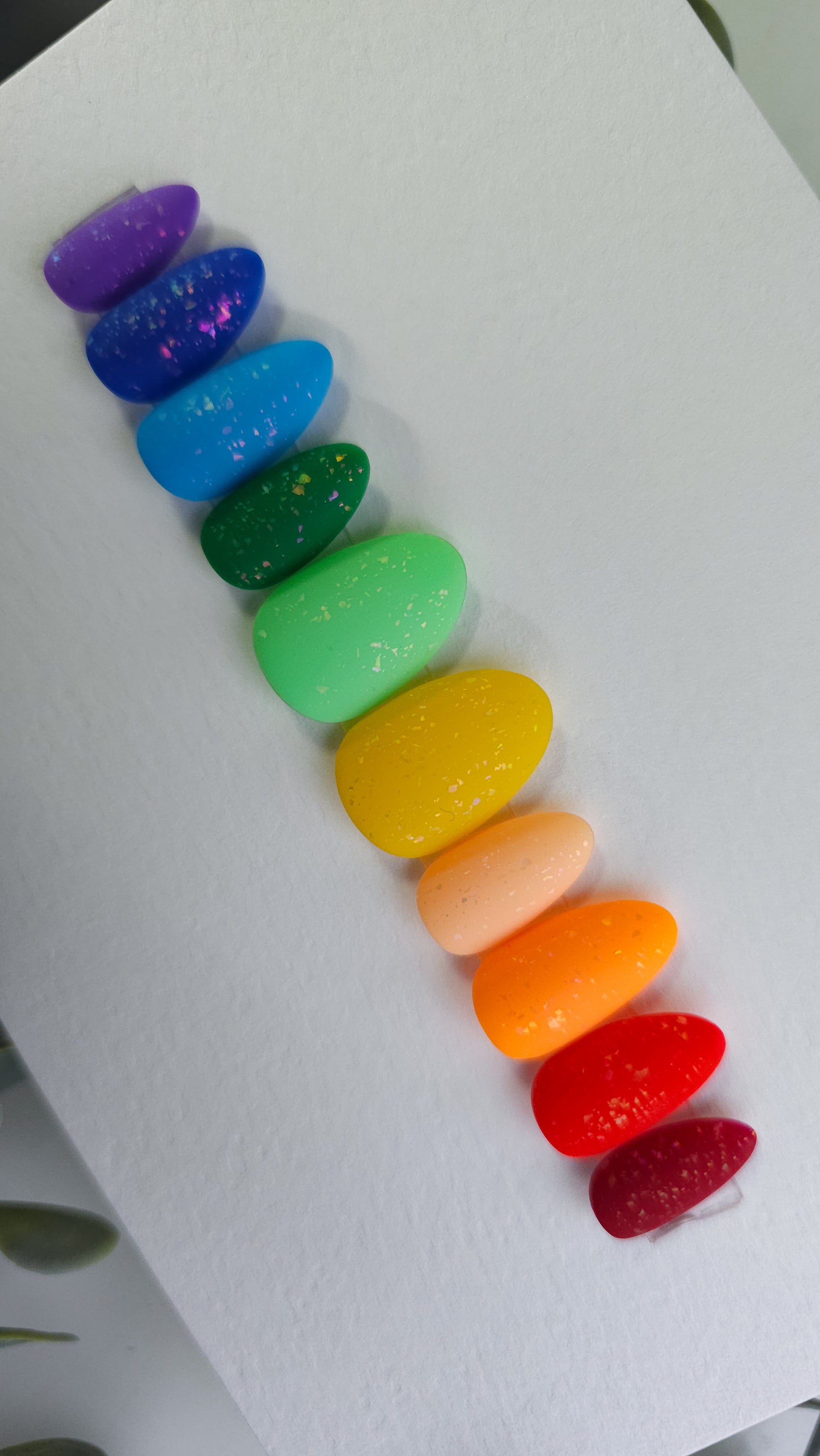 A set of solid rainbow press on gel nails, each nail display one colour in rainbow order to make a strong statement. They are all topped with iridescent flakes, shinning from pink to gold, blue gold, the set is finished matte.
