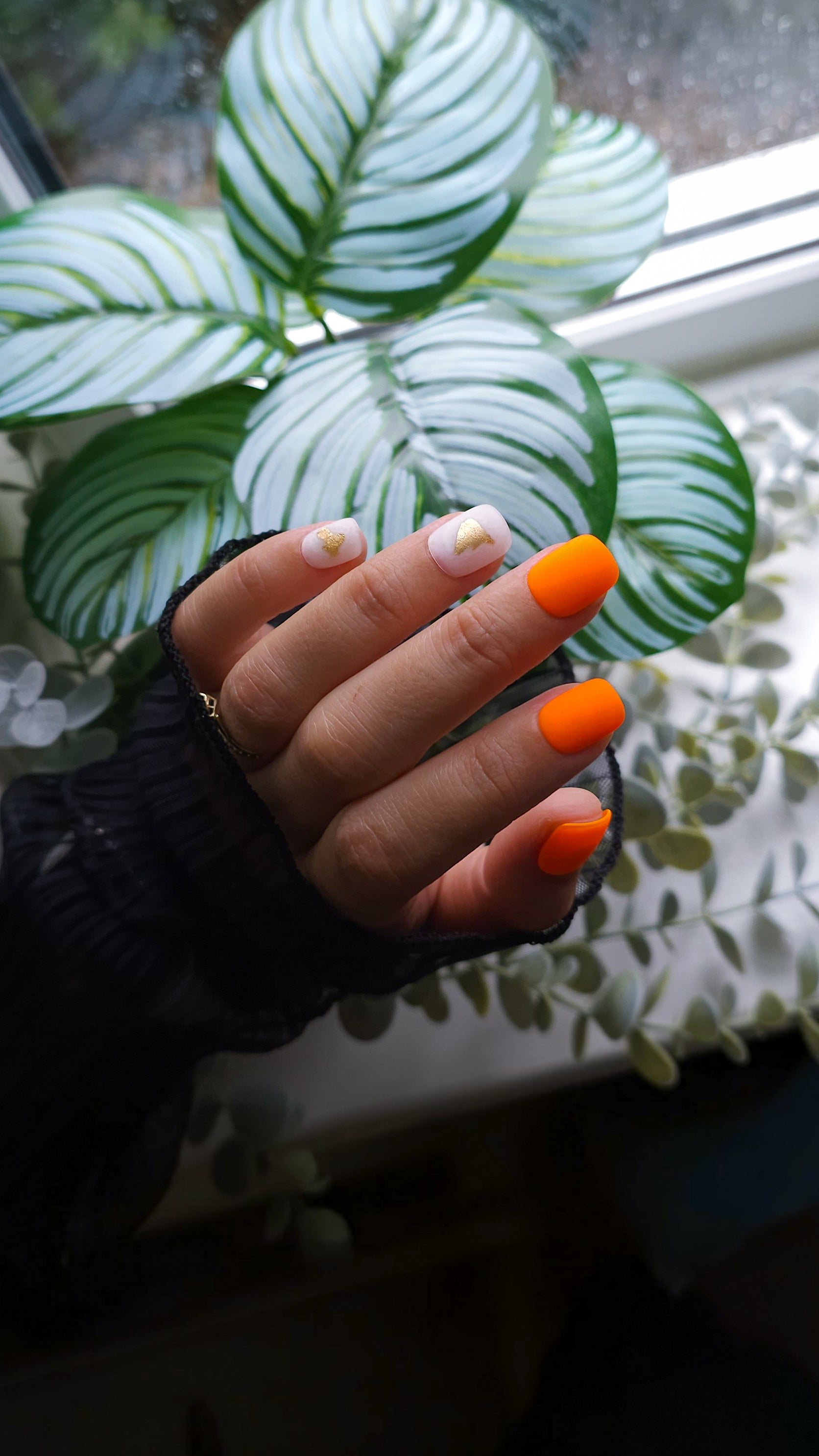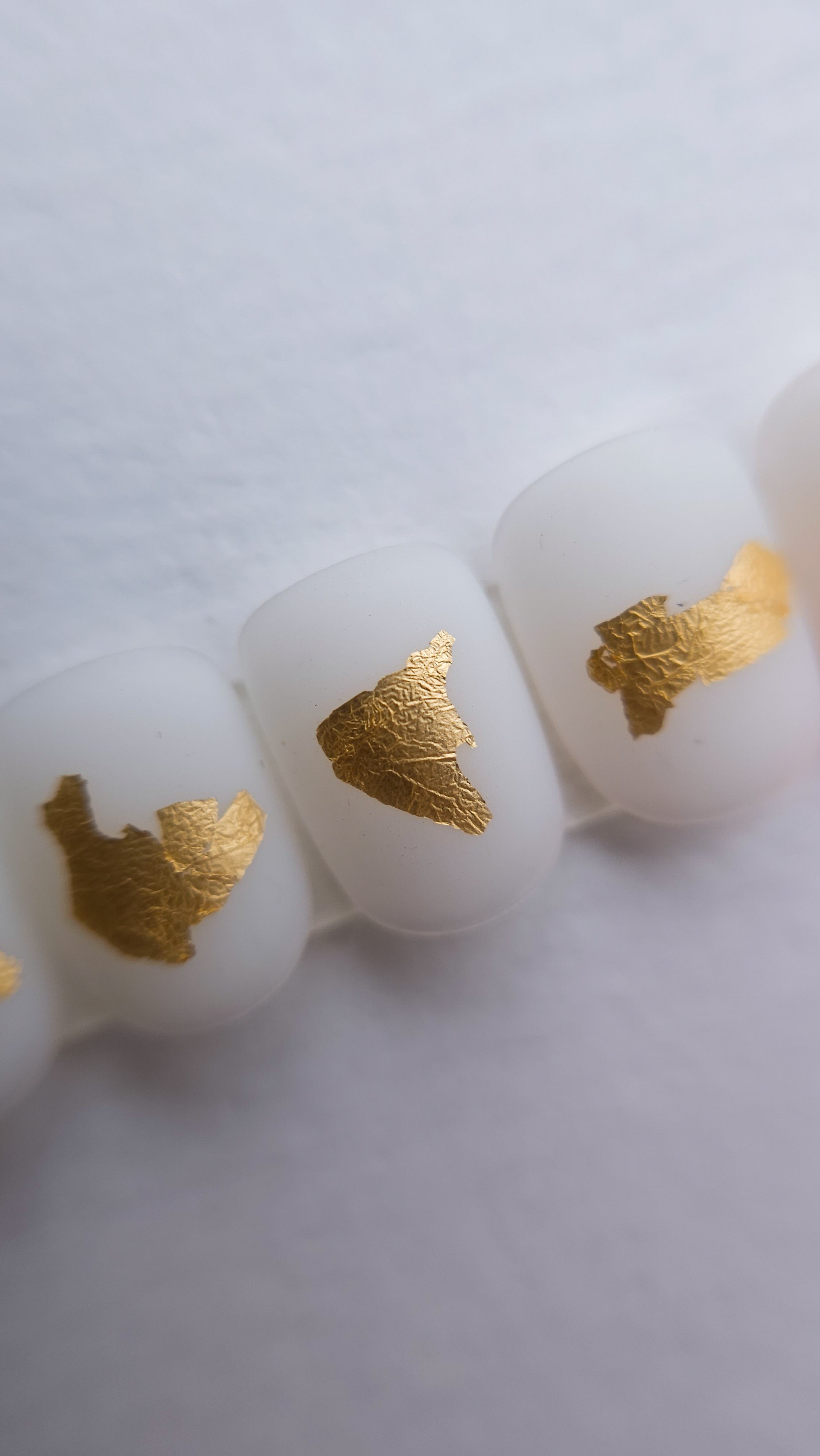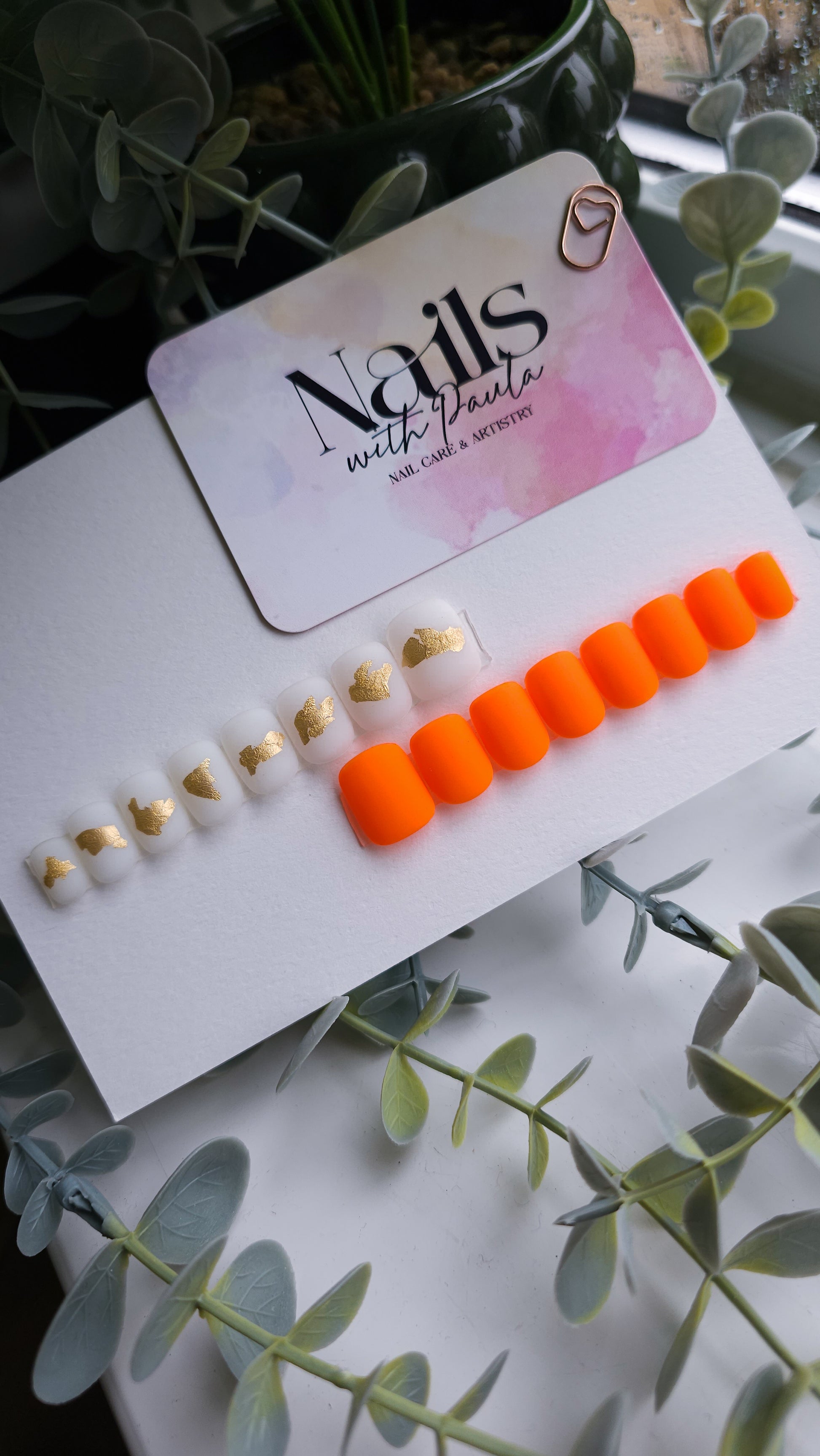 This set of press-on nails pairs gold leaf accents on a milky white matte background with vibrant matte neon orange tips. The combination delivers a striking and elegant look that’s both fresh and eye-catching.